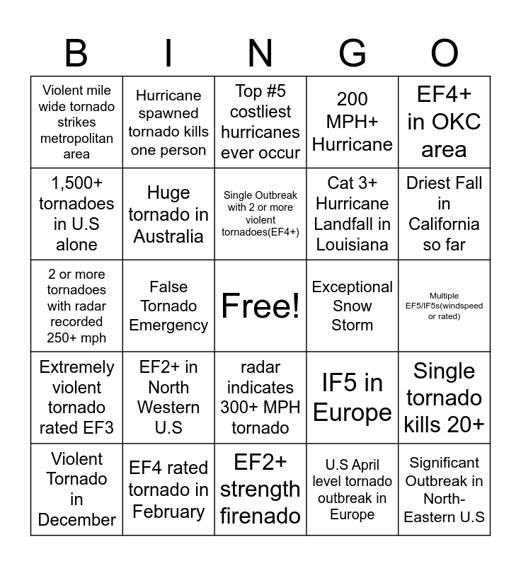 This bingo card has a free space and 24 words: EF2+ in North Western U.S, EF4 rated tornado in February, Single Outbreak with 2 or more violent tornadoes(EF4+), Violent Tornado in December, EF4+ in OKC area, Violent mile wide tornado strikes metropolitan area, 1,500+ tornadoes in U.S alone, Hurricane spawned tornado kills one person, Exceptional Snow Storm, radar indicates 300+ MPH tornado, Cat 3+ Hurricane Landfall in Louisiana, 2 or more tornadoes with radar recorded 250+ mph, IF5 in Europe, Single tornado kills 20+, Huge tornado in Australia, U.S April level tornado outbreak in Europe, Multiple EF5/IF5s(windspeed or rated), Top #5 costliest hurricanes ever occur, Driest Fall in California so far, False Tornado Emergency, Significant Outbreak in North-Eastern U.S, Extremely violent tornado rated EF3, 200 MPH+ Hurricane and EF2+ strength firenado.