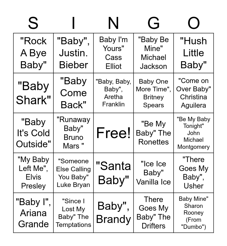 This bingo card has a free space and 24 words: "Someone Else Calling You Baby" Luke Bryan, "Since I Lost My Baby" The Temptations, "Baby, Baby, Baby", Aretha Franklin, "Baby I", Ariana Grande, "Hush Little Baby", "Rock A Bye Baby", "Baby Shark", "Baby", Justin. Bieber, "Be My Baby" The Ronettes, "Santa Baby", Baby One More Time", Britney Spears, "Baby It's Cold Outside", "Ice Ice Baby" Vanilla Ice, "There Goes My Baby", Usher, "Baby Come Back", There Goes My Baby" The Drifters, "Be My Baby Tonight" John Michael Montgomery, Baby I'm Yours" Cass Elliot, "Come on Over Baby" Christina Aguilera, "Runaway Baby" Bruno Mars ", Baby Mine" Sharon Rooney (From "Dumbo"), "My Baby Left Me", Elvis Presley, "Baby Be Mine" Michael Jackson and Baby", Brandy.