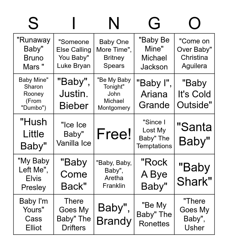 This bingo card has a free space and 24 words: "Baby Come Back", There Goes My Baby" The Drifters, "Be My Baby Tonight" John Michael Montgomery, Baby I'm Yours" Cass Elliot, "Come on Over Baby" Christina Aguilera, "Runaway Baby" Bruno Mars ", Baby Mine" Sharon Rooney (From "Dumbo"), "Someone Else Calling You Baby" Luke Bryan, "Since I Lost My Baby" The Temptations, "Baby, Baby, Baby", Aretha Franklin, "Baby I", Ariana Grande, "Hush Little Baby", "Rock A Bye Baby", "Baby Shark", "Baby", Justin. Bieber, "Be My Baby" The Ronettes, "Santa Baby", Baby One More Time", Britney Spears, "Baby It's Cold Outside", "Ice Ice Baby" Vanilla Ice, "There Goes My Baby", Usher, "My Baby Left Me", Elvis Presley, "Baby Be Mine" Michael Jackson and Baby", Brandy.