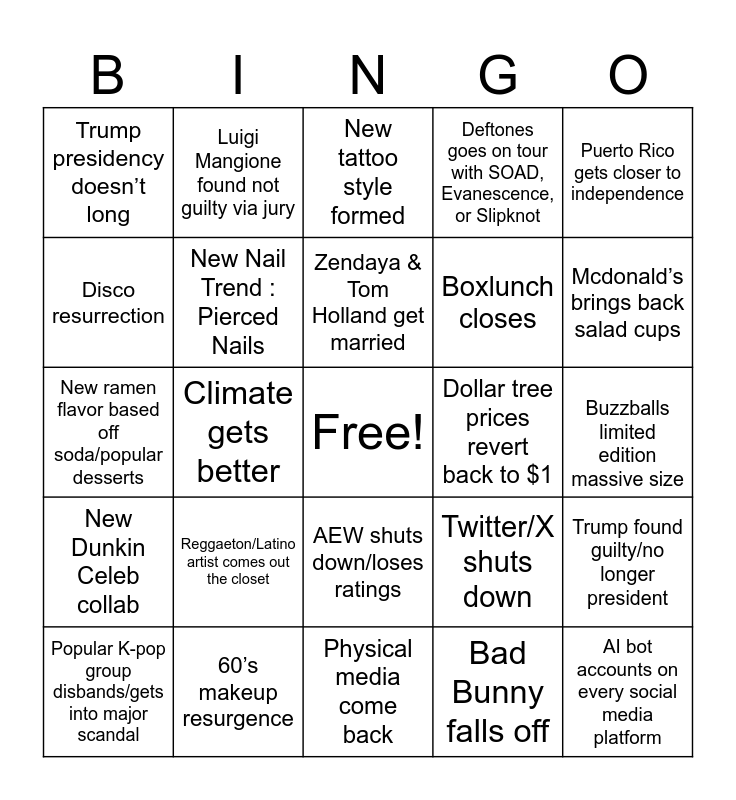 This bingo card has a free space and 24 words: Popular K-pop group disbands/gets into major scandal, Reggaeton/Latino artist comes out the closet, Zendaya & Tom Holland get married, Bad Bunny falls off, Puerto Rico gets closer to independence, Trump presidency doesn’t long, Luigi Mangione found not guilty via jury, New tattoo style formed, Dollar tree prices revert back to $1, Buzzballs limited edition massive size, New ramen flavor based off soda/popular desserts, New Nail Trend : Pierced Nails, Twitter/X shuts down, Trump found guilty/no longer president, Disco resurrection, 60’s makeup resurgence, Physical media come back, Deftones goes on tour with SOAD, Evanescence, or Slipknot, Mcdonald’s brings back salad cups, New Dunkin Celeb collab, Climate gets better, AEW shuts down/loses ratings, Boxlunch closes and AI bot accounts on every social media platform.