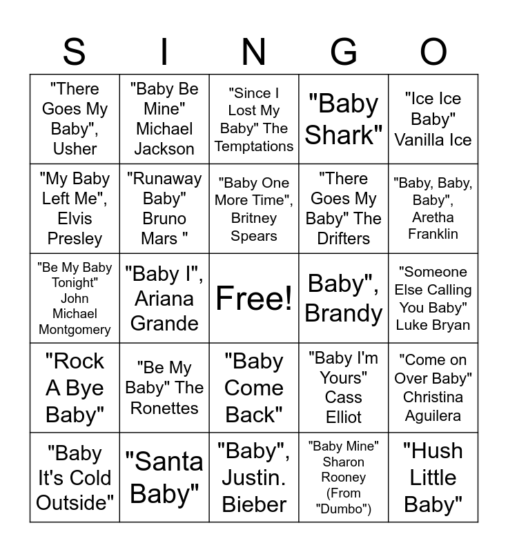 This bingo card has a free space and 24 words: "Be My Baby" The Ronettes, "Santa Baby", "Baby One More Time", Britney Spears, "Baby It's Cold Outside", "Ice Ice Baby" Vanilla Ice, "There Goes My Baby", Usher, "My Baby Left Me", Elvis Presley, "Baby Be Mine" Michael Jackson, Baby", Brandy, "Baby Come Back", "There Goes My Baby" The Drifters, "Be My Baby Tonight" John Michael Montgomery, "Baby I'm Yours" Cass Elliot, "Come on Over Baby" Christina Aguilera, "Runaway Baby" Bruno Mars ", "Baby Mine" Sharon Rooney (From "Dumbo"), "Someone Else Calling You Baby" Luke Bryan, "Since I Lost My Baby" The Temptations, "Baby, Baby, Baby", Aretha Franklin, "Baby I", Ariana Grande, "Hush Little Baby", "Rock A Bye Baby", "Baby Shark" and "Baby", Justin. Bieber.