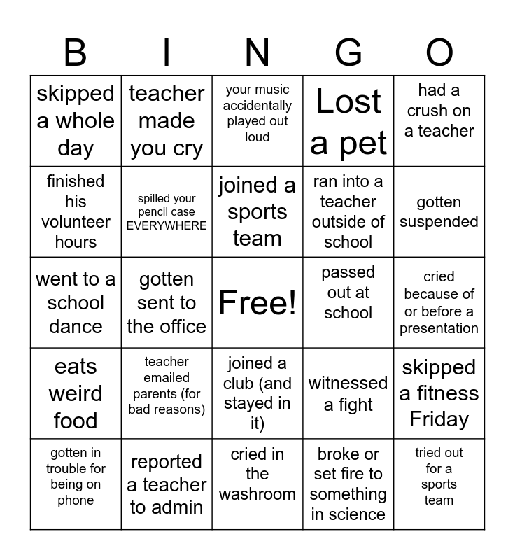 This bingo card has a free space and 24 words: teacher emailed parents (for bad reasons), reported a teacher to admin, joined a sports team, gotten in trouble for being on phone, had a crush on a teacher, skipped a whole day, finished his volunteer hours, teacher made you cry, passed out at school, joined a club (and stayed in it), ran into a teacher outside of school, went to a school dance, witnessed a fight, skipped a fitness Friday, spilled your pencil case EVERYWHERE, broke or set fire to something in science, cried because of or before a presentation, your music accidentally played out loud, gotten suspended, gotten sent to the office, tried out for a sports team, eats weird food, Lost a pet and cried in the washroom.