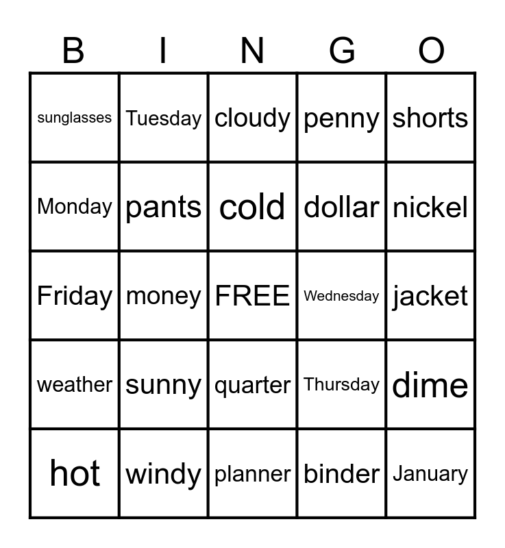 This bingo card has a free space and 24 words: sunny, windy, cold, hot, shorts, sunglasses, Monday, Tuesday, Wednesday, quarter, dollar, Friday, Thursday, dime, pants, binder, jacket, cloudy, nickel, money, January, weather, penny and planner.