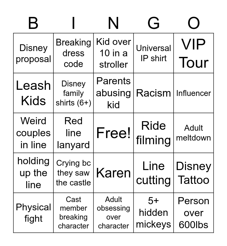 This bingo card has a free space and 24 words: Crying bc they saw the castle, Cast member breaking character, Parents abusing kid, Physical fight, VIP Tour, Disney proposal, Leash Kids, Breaking dress code, Ride filming, Karen, Racism, Weird couples in line, Line cutting, Disney Tattoo, Disney family shirts (6+), 5+ hidden mickeys, Adult meltdown, Kid over 10 in a stroller, Influencer, Red line lanyard, Person over 600lbs, holding up the line, Universal IP shirt and Adult obsessing over character.