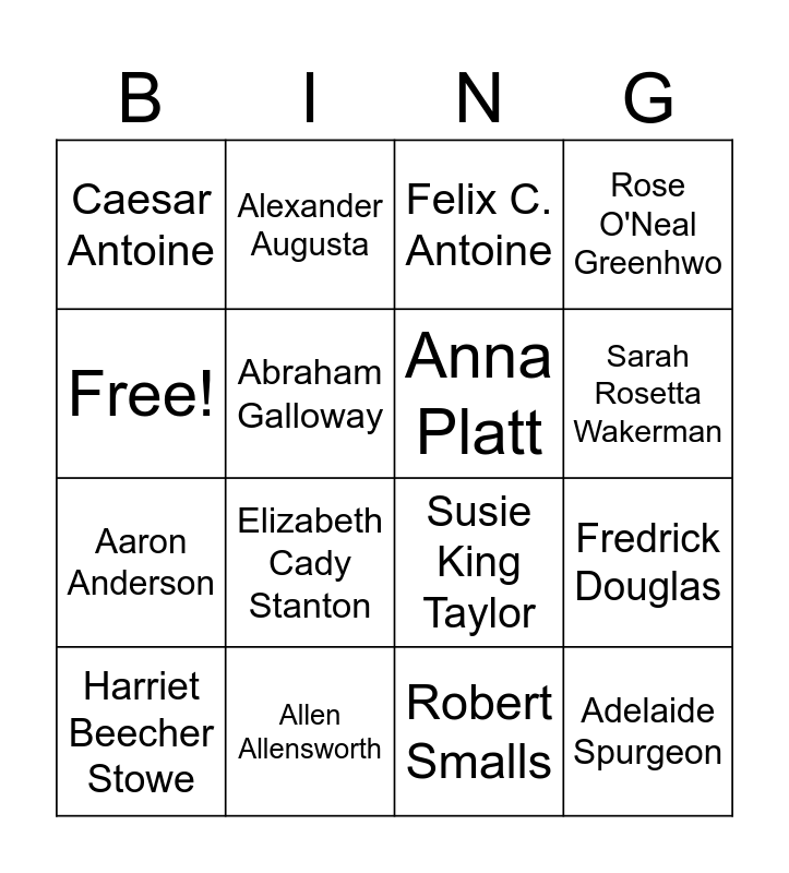 This bingo card has 16 words: Allen Allensworth, Fredrick Douglas, Felix C. Antoine, Caesar Antoine, Aaron Anderson, Alexander Augusta, Susie King Taylor, Robert Smalls, Free!, Abraham Galloway, Harriet Beecher Stowe, Rose O'Neal Greenhwo, Elizabeth Cady Stanton, Sarah Rosetta Wakerman, Anna Platt and Adelaide Spurgeon.