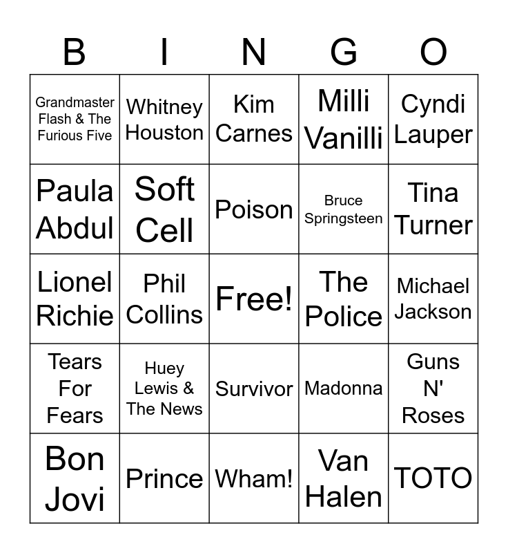 This bingo card has a free space and 30 words: Prince, Blondie, Phil Collins, Duran Duran, Grandmaster Flash & The Furious Five, Kim Carnes, Soft Cell, Survivor, The Police, Wham!, Michael Jackson, TOTO, Van Halen, Rick Springfield, Tina Turner, a-ha, Madonna, Tears For Fears, Huey Lewis & The News, Cyndi Lauper, Lionel Richie, Beastie Boys, Whitney Houston, Bruce Springsteen, Paula Abdul, Milli Vanilli, Guns N' Roses, Bon Jovi, Poison and Def Leppard.