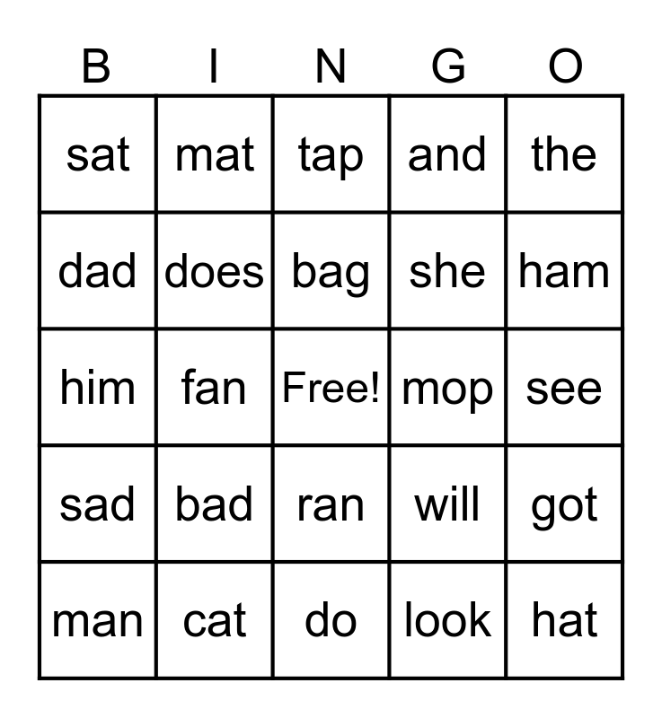 This bingo card has a free space and 24 words: bad, cat, bag, man, the, sat, dad, mat, mop, ran, she, him, will, got, does, look, see, tap, ham, fan, hat, sad, and and do.