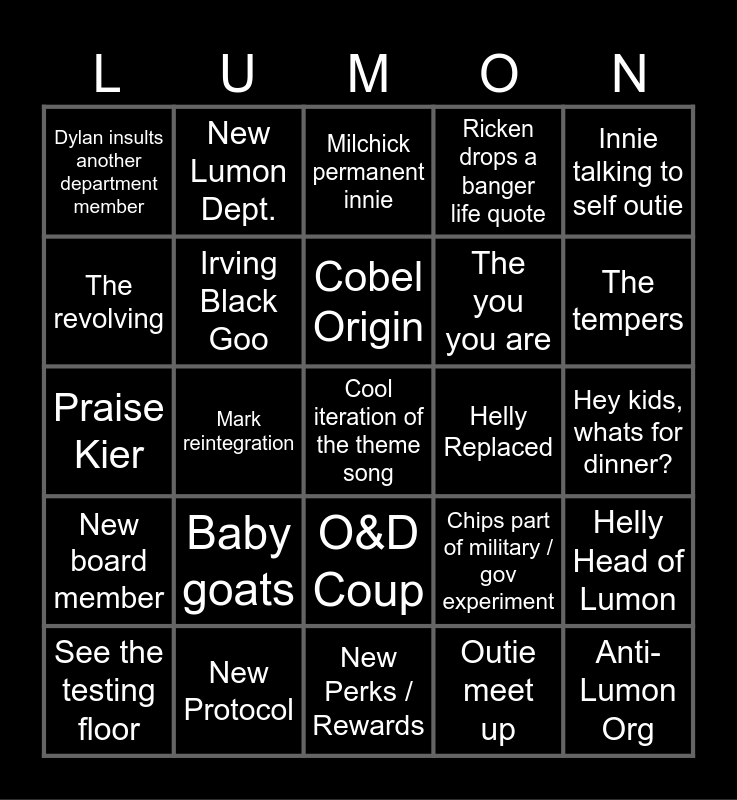This bingo card has a free space and 24 words: See the testing floor, Baby goats, Cobel Origin, Outie meet up, Innie talking to self outie, Dylan insults another department member, New Lumon Dept., Milchick permanent innie, Helly Replaced, Hey kids, whats for dinner?, Praise Kier, Irving Black Goo, Chips part of military / gov experiment, Helly Head of Lumon, The revolving, New Protocol, New Perks / Rewards, Ricken drops a banger life quote, The tempers, New board member, Mark reintegration, O&D Coup, The you you are and Anti-Lumon Org.