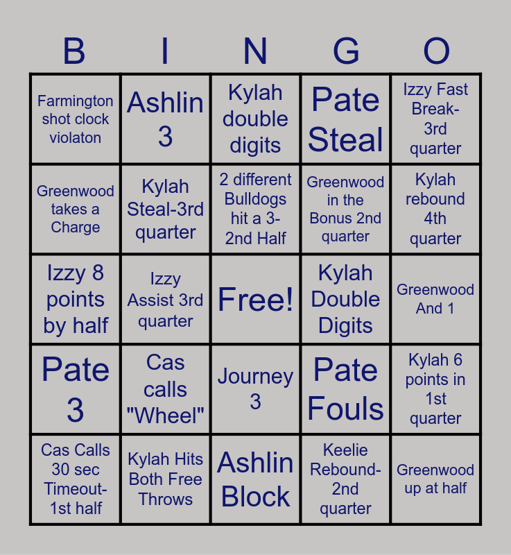 This bingo card has a free space and 54 words: Izzy double digits, Pate 3, Greenwood scores first basket, Ashlin- 2 fouls1st half, Journey 3, Kylah fouls out, Pate Steal, Kylah steal and assist, Greenwood takes a Charge, Farmington Airball, Farmington shot clock violaton, Piper 3-1st quarter, Kylah Hits Both Free Throws, Cas Calls 30 sec Timeout- 1st half, Ashlin Gets the Tip, Ashlin Block, Greenwood up at half, Greenwood in the Bonus 2nd quarter, Farmington in the Bonus 3rd quarter, Greenwood And 1, Pate Fouls, Izzy Steal-1st quarter, Kylah Double Digits, Izzy Fast Break- 3rd quarter, Pate Fast Break-2nd quarter, Ashlin 3, Piper Assist, Halle Scores, Keelie Scores, Keelie Rebound- 2nd quarter, Pate Assist- 1st quarter, Journey Offensive Rebound, Izzy Free Throw, Izzy Hits 2 3's, Kylah double digits, Pate Double Digits, Izzy 8 points by half, Kylah 6 points in 1st quarter, Journey 3-4th quarter, Kylah Steal-3rd quarter, Izzy 3- 3rd quarter, Farmington Turnover- 2nd quarter, Ashlin scores in 2nd quarter, Dance coach starts defense chant, Cas calls "Wheel", Keelie steal, Izzy foul 1st quarter, 2 different Bulldogs hit a 3- 1st Half, 2 different Bulldogs hit a 3- 2nd Half, Izzy Assist 3rd quarter, Kylah rebound 4th quarter, Journey rebound 3rd quarter, Kylah 3 and Ashlin Rebound.