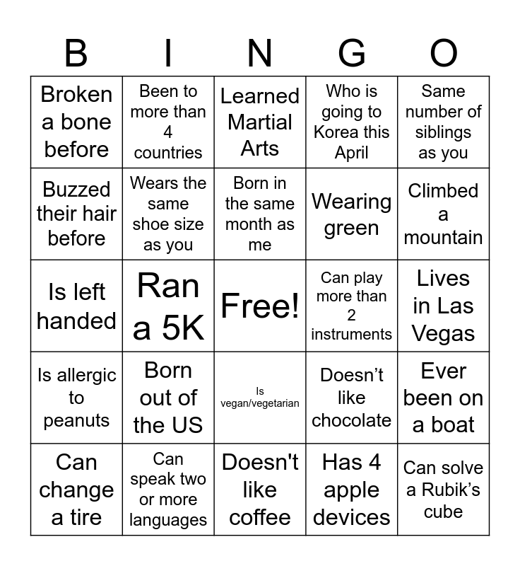 This bingo card has a free space and 24 words: Born out of the US, Can speak two or more languages, Born in the same month as me, Can change a tire, Same number of siblings as you, Broken a bone before, Buzzed their hair before, Been to more than 4 countries, Can play more than 2 instruments, Is vegan/vegetarian, Wearing green, Is left handed, Doesn’t like chocolate, Ever been on a boat, Wears the same shoe size as you, Has 4 apple devices, Lives in Las Vegas, Learned Martial Arts, Climbed a mountain, Ran a 5K, Can solve a Rubik’s cube, Is allergic to peanuts, Who is going to Korea this April and Doesn't like coffee.