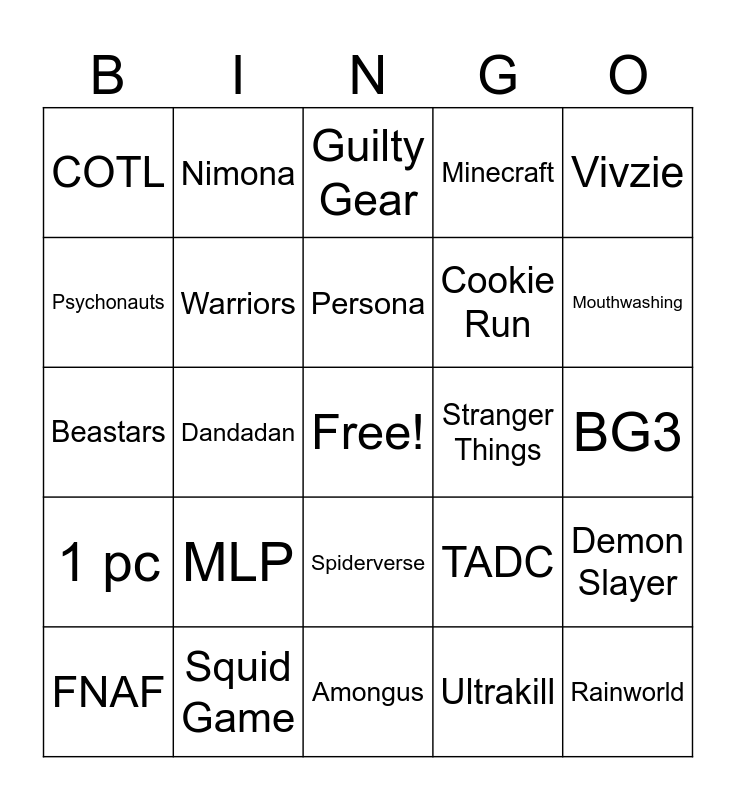 This bingo card has a free space and 33 words: Pokemon, Arcane, Dandadan, JJK, 1 pc, Warriors, Vivzie, FNAF, Nimona, Fire Emblem, Persona, Guilty Gear, Kipo, Vocaloid, Stranger Things, Mouthwashing, Squid Game, Beastars, MLP, TADC, Spiderverse, Lion King, COTL, BG3, Amongus, Rainworld, Minecraft, Cookie Run, Psychonauts, Demon Slayer, Transformers, Ultrakill and Magnus Archives.
