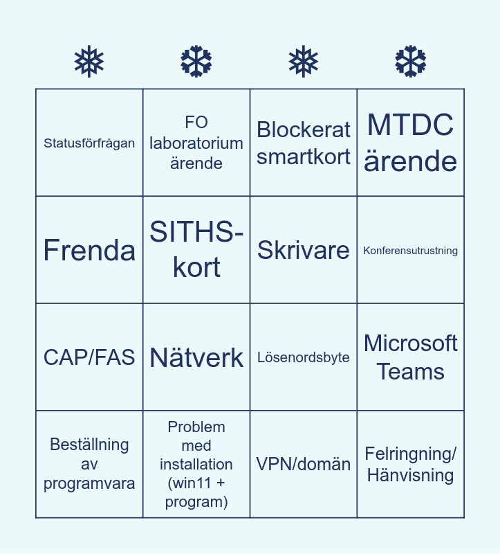 This bingo card has 27 words: Cosmic support/användarstöd, Diktering/TIK, CAP/FAS, Dockningsstation, SITHS-kort, Blockerat smartkort, FO laboratorium ärende, Felringning/ Hänvisning, Problem med installation (win11 + program), Ljudinställningar, Lösenordsbyte, MTDC ärende, Cosmic Mediahanterare, Problem i Microsoft Office-program, Nätverk, Bildskärm, Skrivare, Konferensutrustning, Skype/Zoom, Statusförfrågan, VPN/domän, G: / H: saknas, Microsoft Teams, Beställning av programvara, Mobil enhet, Frenda and Log off.