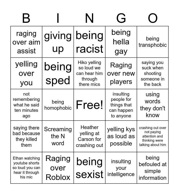 This bingo card has a free space and 24 words: Screaming the N word, Raging over Roblox, Hiko yelling so loud we can hear him through there mics, Ethan watching youtube shorts so loud you can hear it through his mic, being transphobic, raging over aim assist, yelling over you, giving up, insulting people for things that can happen to anyone, Heather yelling at Carson for crashing out, Raging over new players, not remembering what he said ten minutes ago, yelling kys as loud as possible, crashing out over not paying attention and thinking were talking about him, being sped, insulting your intelligence, using words they don't know, being racist, saying you suck when shooting someone in the back, being homophobic, being befouled at simple information, saying there bad because they killed them, being hella gay and being sexist.