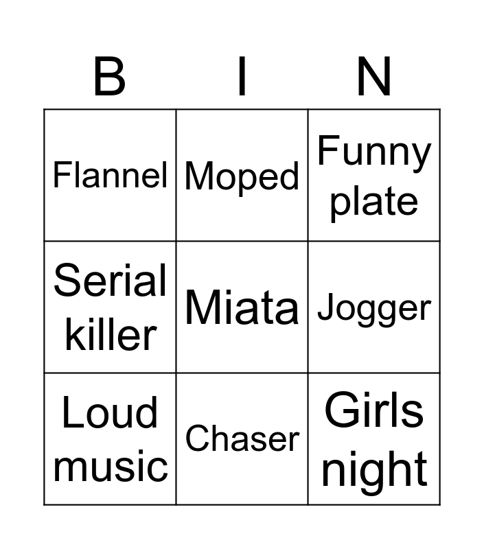 This bingo card has a free space and 8 words: Jogger, Funny plate, Moped, Loud music, Flannel, Girls night, Serial killer and Chaser.