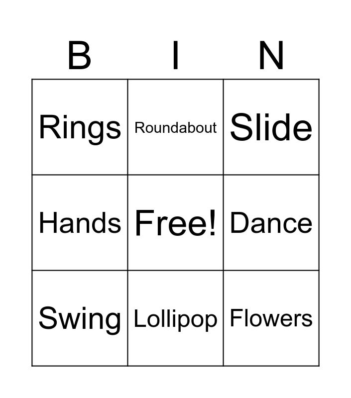 This bingo card has a free space and 9 words: Swing, Slide, Roundabout, Hands, Rings, Dance, Flowers, Cake and Lollipop.
