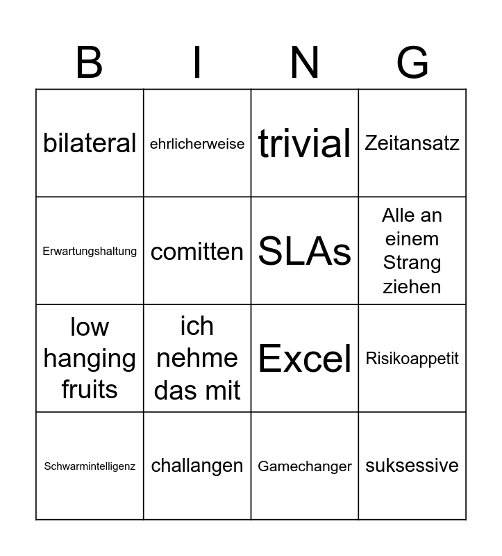 This bingo card has 17 words: Gamechanger, Schwarmintelligenz, trivial, bilateral, ich nehme das mit, Zeitansatz, Risikoappetit, SLAs, Alle an einem Strang ziehen, comitten, challangen, Excel, Erwartungshaltung, ehrlicherweise, low hanging fruits, Synergien and suksessive.