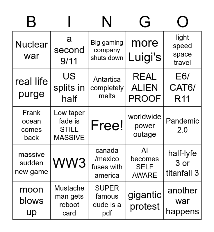 This bingo card has a free space and 24 words: WW3, Mustache man gets reboot card, Antartica completely melts, moon blows up, light speed space travel, Nuclear war, real life purge, a second 9/11, worldwide power outage, canada /mexico fuses with america, REAL ALIEN PROOF, Frank ocean comes back, AI becomes SELF AWARE, half-lyfe 3 or titanfall 3, US splits in half, gigantic protest, Pandemic 2.0, Big gaming company shuts down, E6/ CAT6/ R11, Low taper fade is STILL MASSIVE, another war happens, massive sudden new game, more Luigi's and SUPER famous dude is a pdf.