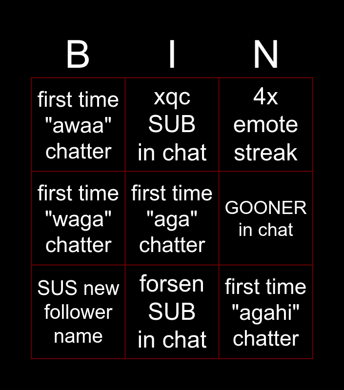 This bingo card has a free space and 8 words: GOONER in chat, 4x emote streak, xqc SUB in chat, SUS new follower name, first time "awaa" chatter, first time "agahi" chatter, first time "waga" chatter and forsen SUB in chat.