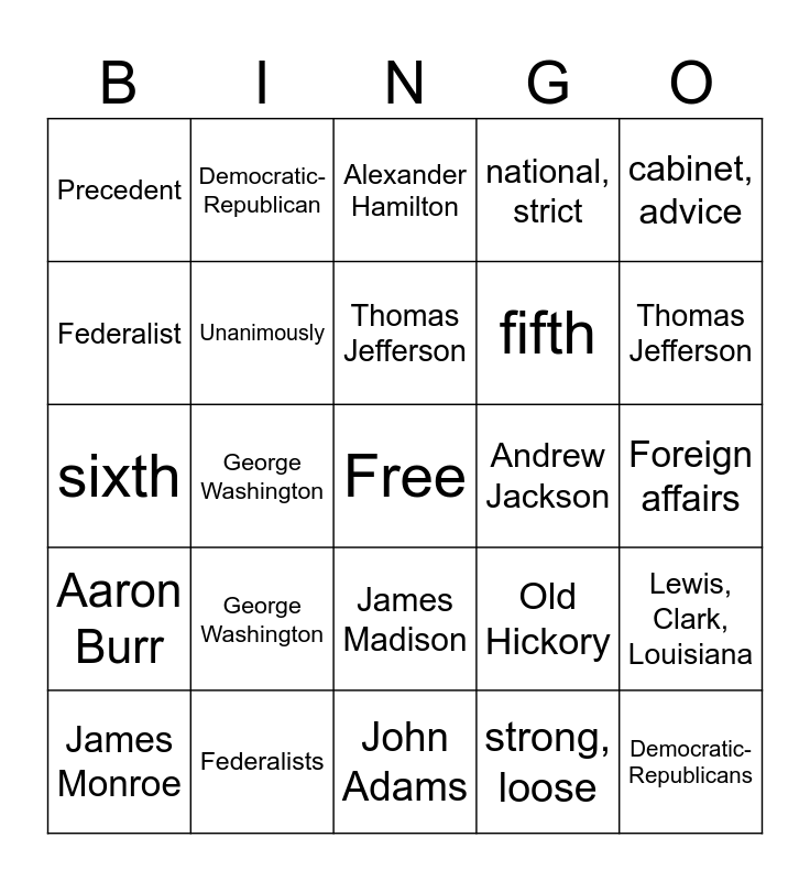 This bingo card has a free space and 25 words: George Washington, John Adams, Thomas Jefferson, James Monroe, cabinet, advice, Precedent, Federalist, Democratic-Republican, Andrew Jackson, James Madison, fifth, sixth, Old Hickory, Lewis, Clark, Louisiana, Unanimously, John Quincy Adams, Foreign affairs, Alexander Hamilton, Thomas Jefferson, George Washington, Democratic-Republicans, Federalists, Aaron Burr, national, strict and strong, loose.