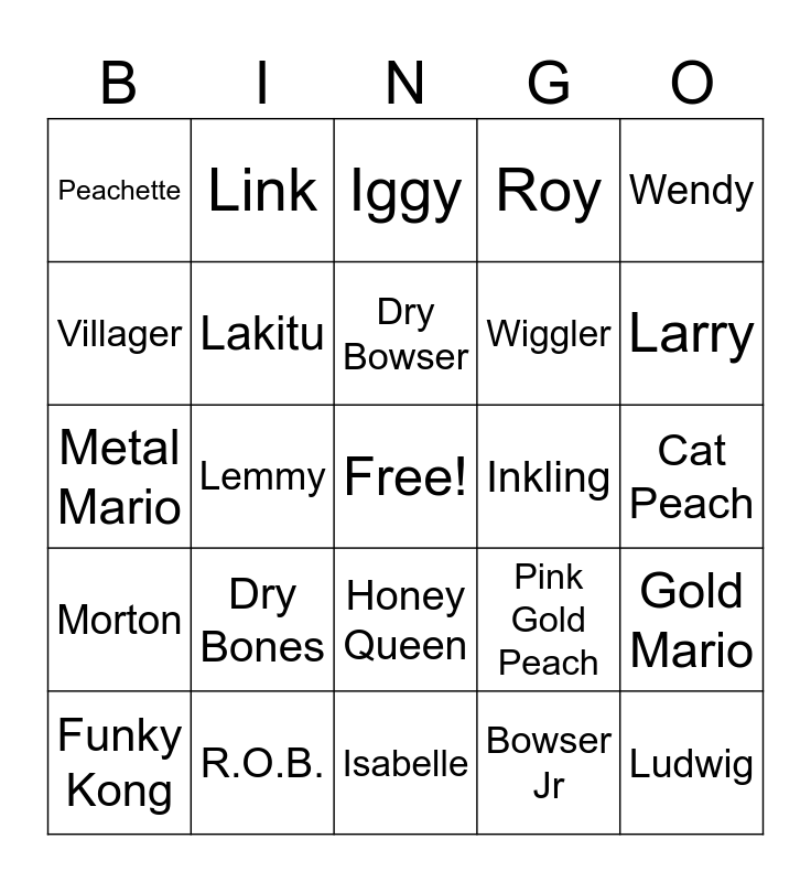 This bingo card has a free space and 24 words: Dry Bones, R.O.B., Dry Bowser, Funky Kong, Wendy, Peachette, Villager, Link, Inkling, Honey Queen, Wiggler, Metal Mario, Pink Gold Peach, Gold Mario, Lakitu, Bowser Jr, Cat Peach, Iggy, Larry, Lemmy, Ludwig, Morton, Roy and Isabelle.