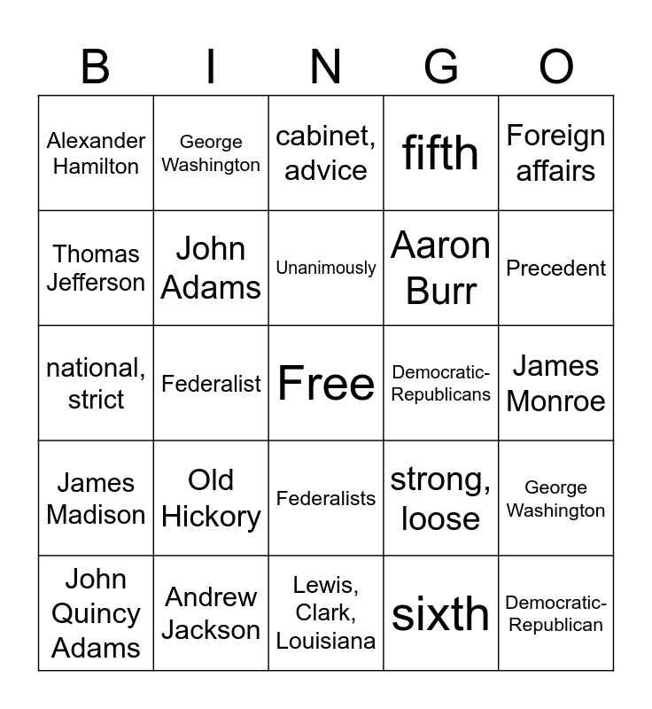 This bingo card has a free space and 25 words: Old Hickory, Lewis, Clark, Louisiana, Unanimously, John Quincy Adams, Foreign affairs, Alexander Hamilton, Thomas Jefferson, George Washington, Democratic-Republicans, Federalists, Aaron Burr, national, strict, strong, loose, George Washington, John Adams, Thomas Jefferson, James Monroe, cabinet, advice, Precedent, Federalist, Democratic-Republican, Andrew Jackson, James Madison, fifth and sixth.