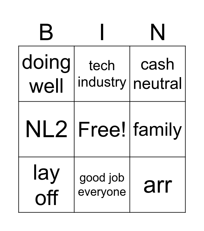 This bingo card has a free space and 8 words: family, cash neutral, tech industry, lay off, doing well, arr, NL2 and good job everyone.