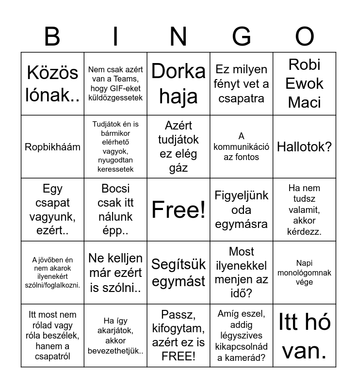 This bingo card has a free space and 24 words: Ne kelljen már ezért is szólni.., Ha így akarjátok, akkor bevezethetjük.., Azért tudjátok ez elég gáz, Itt most nem rólad vagy róla beszélek, hanem a csapatról, Robi Ewok Maci, Közös lónak.., Ropbikháám, Nem csak azért van a Teams, hogy GIF-eket küldözgessetek, Figyeljünk oda egymásra, Segítsük egymást, A kommunikáció az fontos, Egy csapat vagyunk, ezért.., Most ilyenekkel menjen az idő?, Napi monológomnak vége, Tudjátok én is bármikor elérhető vagyok, nyugodtan keressetek, Amíg eszel, addig légyszives kikapcsolnád a kamerád?, Ha nem tudsz valamit, akkor kérdezz., Dorka haja, Hallotok?, Bocsi csak itt nálunk épp.., Itt hó van., A jövőben én nem akarok ilyenekért szólni/foglalkozni., Ez milyen fényt vet a csapatra and Passz, kifogytam, azért ez is FREE!.