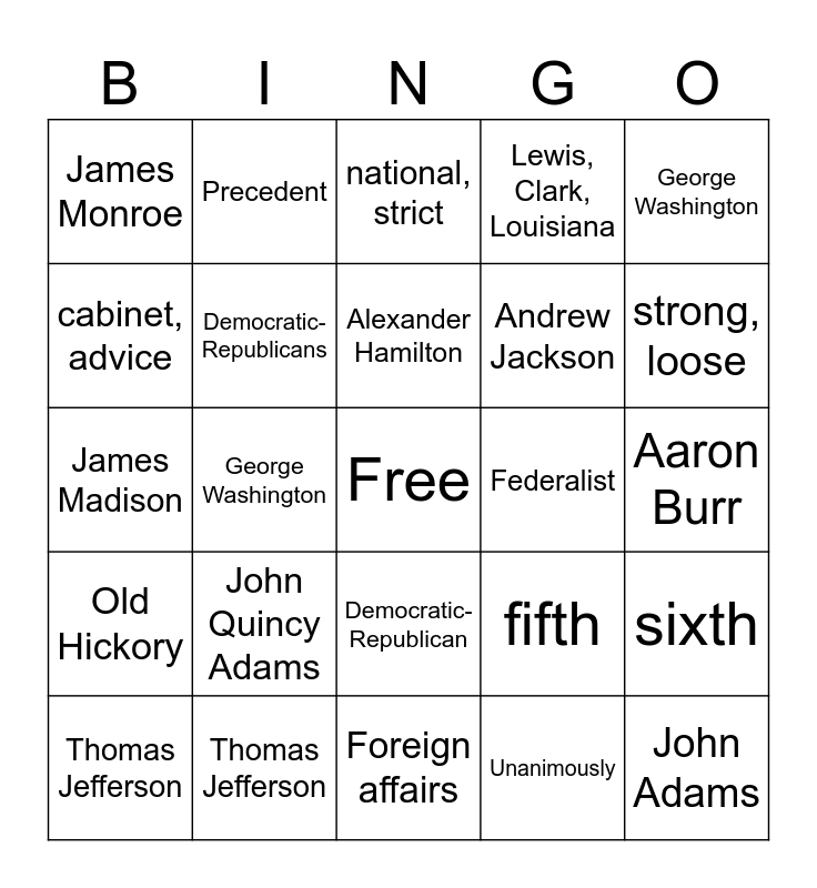 This bingo card has a free space and 25 words: John Quincy Adams, Foreign affairs, Alexander Hamilton, Thomas Jefferson, George Washington, James Monroe, cabinet, advice, Precedent, Federalist, Democratic-Republican, Andrew Jackson, James Madison, fifth, sixth, Democratic-Republicans, Federalists, Aaron Burr, national, strict, strong, loose, George Washington, John Adams, Thomas Jefferson, Old Hickory, Lewis, Clark, Louisiana and Unanimously.