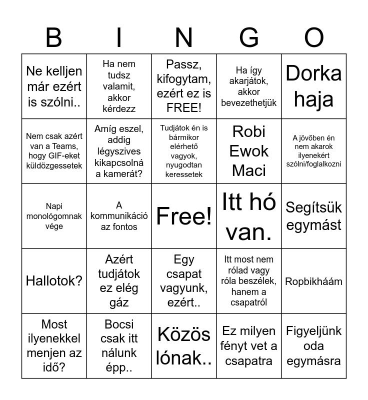 This bingo card has a free space and 24 words: Azért tudjátok ez elég gáz, Bocsi csak itt nálunk épp.., Tudjátok én is bármikor elérhető vagyok, nyugodtan keressetek, Most ilyenekkel menjen az idő?, Dorka haja, Ne kelljen már ezért is szólni.., Nem csak azért van a Teams, hogy GIF-eket küldözgessetek, Ha nem tudsz valamit, akkor kérdezz, Itt hó van., Egy csapat vagyunk, ezért.., Robi Ewok Maci, Napi monológomnak vége, Itt most nem rólad vagy róla beszélek, hanem a csapatról, Ropbikháám, Amíg eszel, addig légyszives kikapcsolná a kamerát?, Ez milyen fényt vet a csapatra, Segítsük egymást, Passz, kifogytam, ezért ez is FREE!, A jövőben én nem akarok ilyenekért szólni/foglalkozni, A kommunikáció az fontos, Figyeljünk oda egymásra, Hallotok?, Ha így akarjátok, akkor bevezethetjük and Közös lónak...