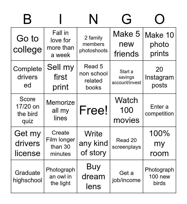 This bingo card has a free space and 24 words: Create Film longer than 30 minutes, Photograph an owl in the light, Read 5 non school related books, Graduate highschool, Make 10 photo prints, Go to college, Complete drivers ed, Fall in love for more than a week, Watch 100 movies, Write any kind of story, Start a savings account/invest, Score 17/20 on the bird quiz, Read 20 screenplays, 100% my room, Sell my first print, Get a job/income, Enter a competition, 2 family members photoshoots, 20 Instagram posts, Memorize all my lines, Photograph 100 new birds, Get my drivers license, Make 5 new friends and Buy dream lens.