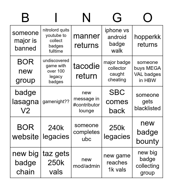 This bingo card has a free space and 24 words: 240k legacies, taz gets 250k vals, tacodie return, new big badge chain, hopperkk returns, someone major is banned, BOR new group, nitrolord quits youtube to collect badges fulltime, SBC comes back, someone completes ubc, major badge collector caught cheating, badge lasagna V2, 250k legacies, new badge bounty, undiscovered game with over 100 legacy badges, new game reaches 1k vals, someone gets blacklisted, manner returns, someone buys MEGA VAL badges in HBW, gamenight??, new big badge collecting group, BOR website, iphone vs android badge walk and new mod/admin.