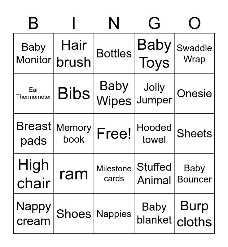 This bingo card has a free space and 25 words: ram, Nappies, Baby Wipes, Nappy cream, Swaddle Wrap, Baby Monitor, Ear Thermometer, Hair brush, Hooded towel, Milestone cards, Jolly Jumper, Breast pads, Stuffed Animal, Baby Bouncer, Bibs, Socks, Sheets, Bottles, Onesie, Memory book, Burp cloths, Shoes, High chair, Baby Toys and Baby blanket.
