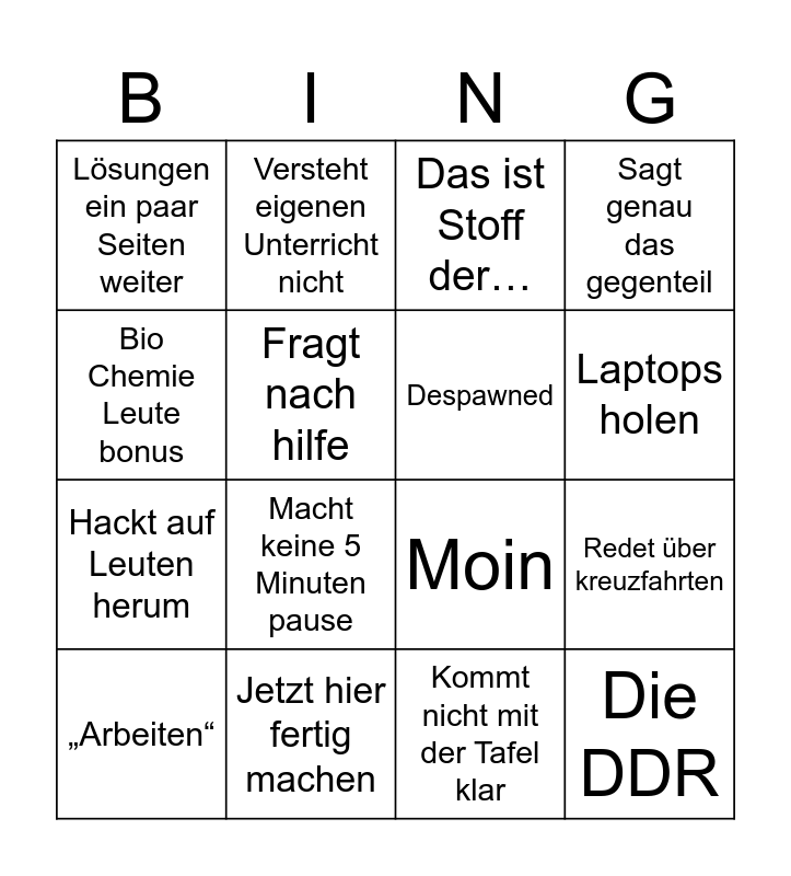 This bingo card has 16 words: Jetzt hier fertig machen, Redet über kreuzfahrten, Das ist Stoff der…, Lösungen ein paar Seiten weiter, Hackt auf Leuten herum, Versteht eigenen Unterricht nicht, Moin, Kommt nicht mit der Tafel klar, Bio Chemie Leute bonus, Fragt nach hilfe, „Arbeiten“, Sagt genau das gegenteil, Macht keine 5 Minuten pause, Laptops holen, Despawned and Die DDR.