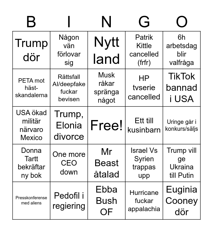 This bingo card has a free space and 24 words: One more CEO down, Pedofil i regiering, Musk råkar spränga något, Presskonferense med aliens, 6h arbetsdag blir valfråga, Trump dör, PETA mot häst-skandalerna, Någon vän förlovar sig, Ett till kusinbarn, Mr Beast åtalad, HP tvserie cancelled, USA ökad militär närvaro Mexico, Israel Vs Syrien trappas upp, Trump vill ge Ukraina till Putin, Rättsfall AI/deepfake fuckar bevisen, Hurricane fuckar appalachia, Uringe går i konkurs/säljs, Nytt land, TikTok bannad i USA, Trump, Elonia divorce, Euginia Cooney dör, Donna Tartt bekräftar ny bok, Patrik Kittle cancelled (frfr) and Ebba Bush OF.