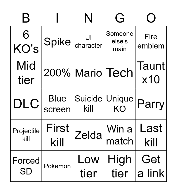 This bingo card has 25 words: First kill, Low tier, Mario, Forced SD, Fire emblem, 6 KO’s, Mid tier, Spike, Unique KO, Zelda, Tech, DLC, Win a match, Last kill, 200%, Get a link, Parry, UI character, Taunt x10, Blue screen, Suicide kill, Pokemon, Projectile kill, Someone else's main and High tier.