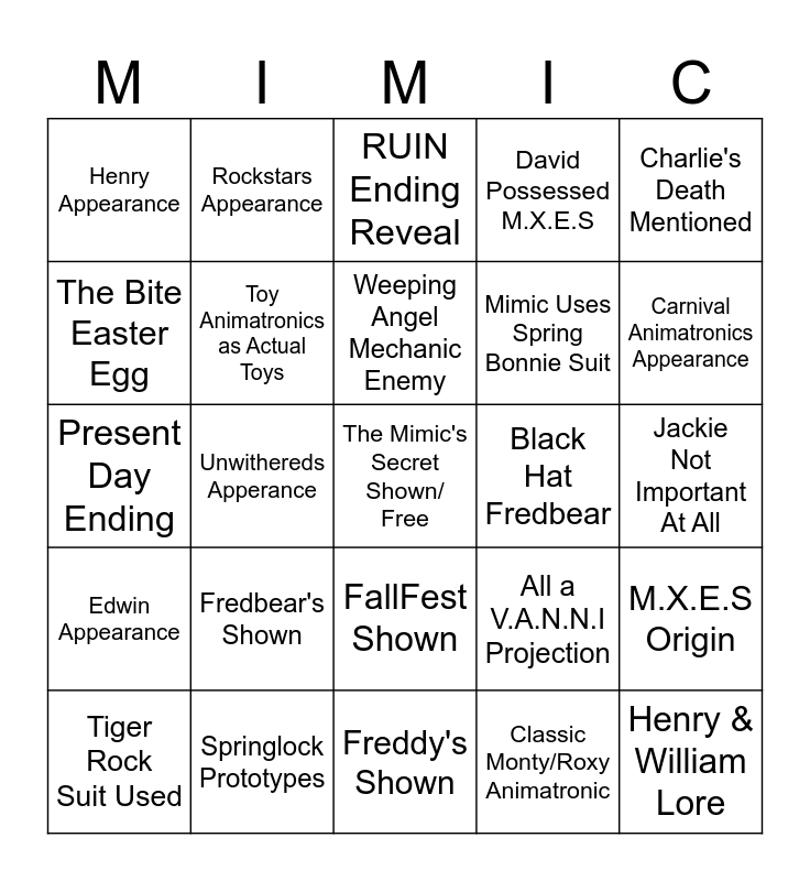 This bingo card has a free space and 24 words: Fredbear's Shown, Springlock Prototypes, Weeping Angel Mechanic Enemy, Tiger Rock Suit Used, Charlie's Death Mentioned, Henry Appearance, The Bite Easter Egg, Rockstars Appearance, Black Hat Fredbear, FallFest Shown, Mimic Uses Spring Bonnie Suit, Present Day Ending, All a V.A.N.N.I Projection, M.X.E.S Origin, Toy Animatronics as Actual Toys, Classic Monty/Roxy Animatronic, Jackie Not Important At All, RUIN Ending Reveal, Carnival Animatronics Appearance, Unwithereds Apperance, Henry & William Lore, Edwin Appearance, David Possessed M.X.E.S and Freddy's Shown.
