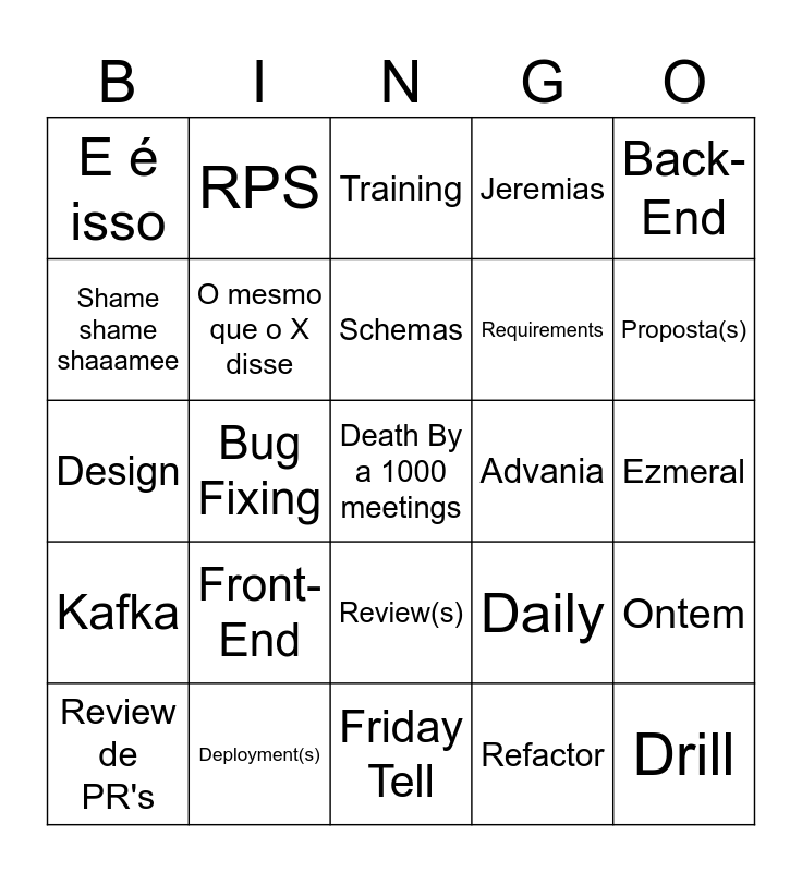 This bingo card has 30 words: Deployment(s), Sync(s), Bug Fixing, Workshop(s), E é isso, Training, O mesmo que o X disse, Review(s), Advania, Friday Tell, Ezmeral, Death By a 1000 meetings, Refactor, Drill, Proposta(s), 1:1, Daily, Kafka, Front-End, Back-End, Design, Recommerce, RPS, Requirements, Shame shame shaaamee, Jeremias, Ontem, Review de PR's, Schemas and Documentação.
