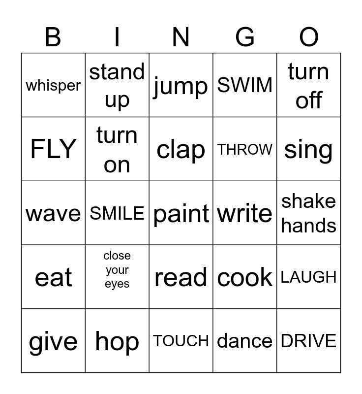 This bingo card has a free space and 34 words: run, dance, turn around, drink, eat, turn on, turn off, give, stand up, sit, clap, jump, play, watch, write, sing, hop, wave, close your eyes, cook, read, climb, whisper, shake hands, TOUCH, DRIVE, SWIM, KICK, THROW, FLY, CATCH, SMILE, LAUGH and CRY.