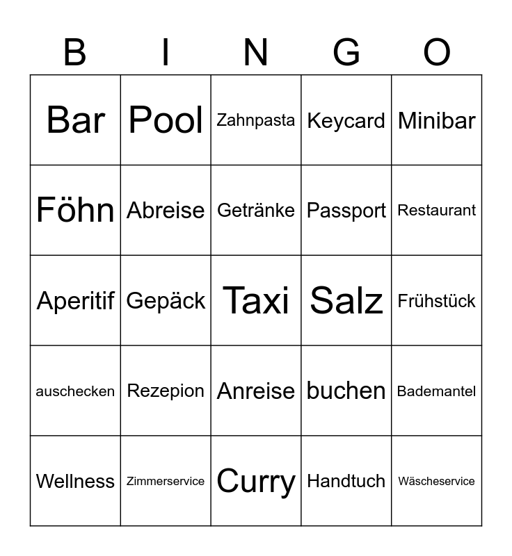 This bingo card has 30 words: Zimmerservice, Koch, Gepäck, Vegetarisch, Bar, Zahnpasta, Abreise, Anreise, Salz, Curry, Frühstück, Taxi, Handtuch, Wäscheservice, Restaurant, Sauna, buchen, auschecken, Rezepion, Minibar, Aperitif, Nachtisch, Pool, Passport, Föhn, Keycard, Bademantel, Wellness, Getränke and eindecken.
