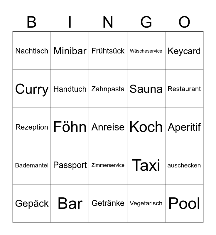 This bingo card has 30 words: Bar, buchen, Föhn, Abreise, Nachtisch, Frühtsück, Handtuch, Zimmerservice, Koch, Getränke, Aperitif, Anreise, Vegetarisch, Pool, Restaurant, eindecken, Taxi, Bademantel, Passport, Keycard, Rezeption, Wellness, Minibar, Sauna, Curry, Wäscheservice, auschecken, Gepäck, Zahnpasta and Salz.