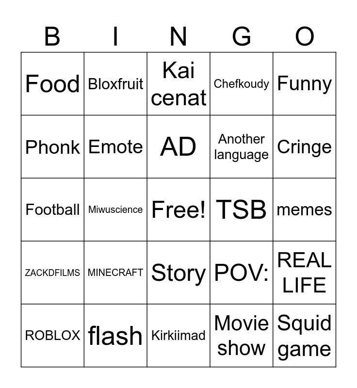 This bingo card has a free space and 24 words: ROBLOX, MINECRAFT, AD, Movie show, Funny, Food, Bloxfruit, Kai cenat, TSB, memes, Football, Emote, POV:, REAL LIFE, Phonk, flash, Kirkiimad, Chefkoudy, Cringe, ZACKDFILMS, Miwuscience, Story, Another language and Squid game.