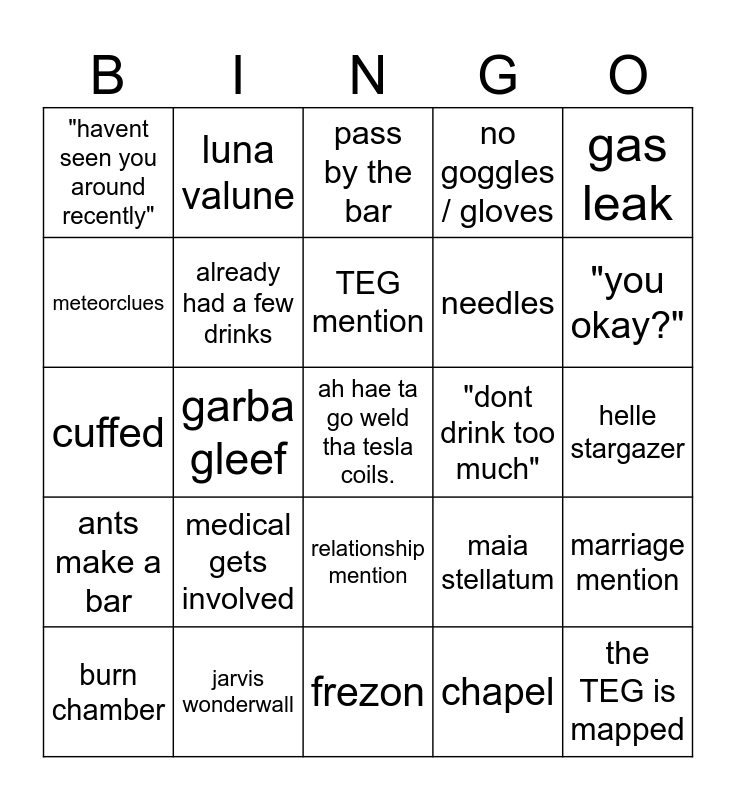 This bingo card has a free space and 24 words: burn chamber, medical gets involved, TEG mention, chapel, gas leak, "havent seen you around recently", luna valune, pass by the bar, "dont drink too much", helle stargazer, cuffed, already had a few drinks, maia stellatum, marriage mention, meteorclues, jarvis wonderwall, frezon, no goggles / gloves, "you okay?", ants make a bar, garba gleef, relationship mention, needles and the TEG is mapped.