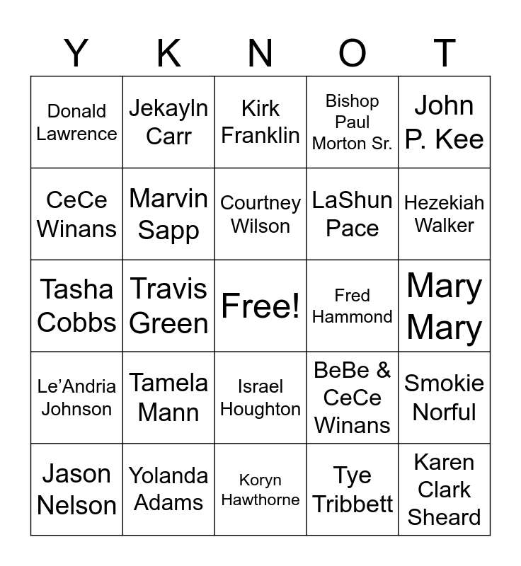 This bingo card has a free space and 29 words: Jason Nelson, Jonathan McReynolds, Travis Green, Ricky Dillard, Donald Lawrence, Kirk Franklin, Marvin Sapp, Tamela Mann, Fred Hammond, Yolanda Adams, Mary Mary, Karen Clark Sheard, Koryn Hawthorne, Tye Tribbett, Hezekiah Walker, Jekalyn Carr, Israel Houghton, Le’Andria Johnson, John P. Kee, Tasha Cobbs, BeBe & CeCe Winans, Donnie McClurkin, LaShun Pace, CeCe Winans, Bishop Paul Morton Sr., Jekayln Carr, Smokie Norful, Courtney Wilson and Byron Cage.