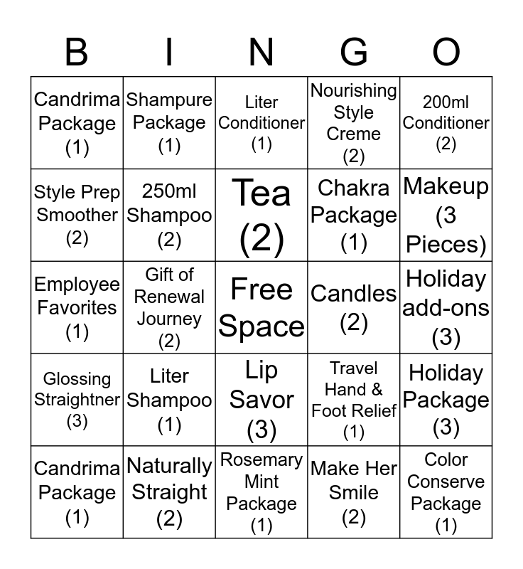 This bingo card has a free space and 24 words: Liter Shampoo (1), Naturally Straight (2), Tea (2), Candrima Package (1), 200ml Conditioner (2), Candrima Package (1), Style Prep Smoother (2), Shampure Package (1), Candles (2), Lip Savor (3), Chakra Package (1), Employee Favorites (1), Travel Hand & Foot Relief (1), Holiday Package (3), 250ml Shampoo (2), Make Her Smile (2), Holiday add-ons (3), Liter Conditioner (1), Makeup (3 Pieces), Gift of Renewal Journey (2), Color Conserve Package (1), Glossing Straightner (3), Nourishing Style Creme (2) and Rosemary Mint Package (1).