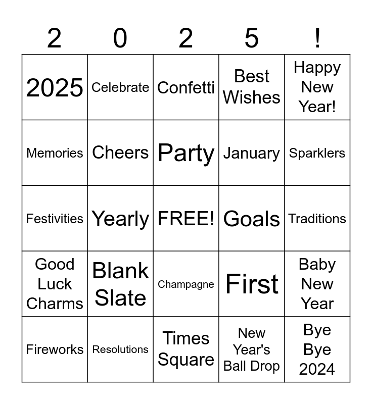 This bingo card has a free space and 34 words: Countdown, New Year's Ball Drop, Wishing Well, New Years Eve, Good Luck Charms, Cheers, Happy New Year!, Fireworks, Celebrate, Fortune, Party, Confetti, Balloons, New Years Day, Goals, Sparklers, Resolutions, Festivities, Blank Slate, First, Champagne, Midnight, 2025, Traditions, Times Square, Bye Bye 2024, Best Wishes, Dancing, January, Memories, Parade, Yearly, Baby New Year and Clock.