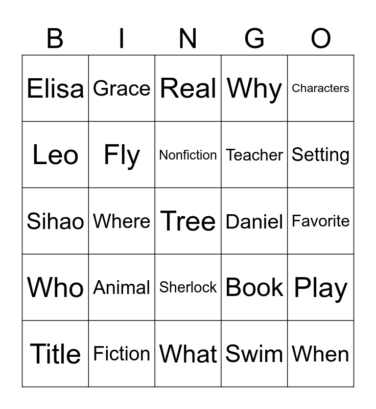 This bingo card has a free space and 24 words: Animal, Fiction, Nonfiction, Title, Characters, Elisa, Leo, Grace, Daniel, Sherlock, Teacher, Sihao, Book, Play, Fly, Swim, Favorite, Real, Setting, Where, When, Who, Why and What.