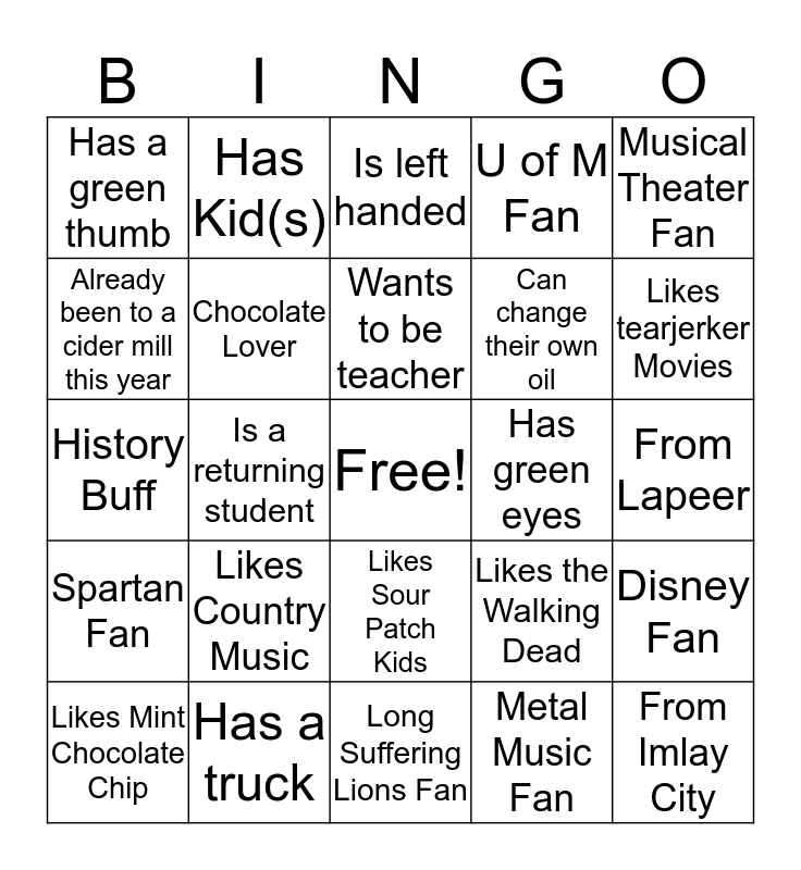 This bingo card has a free space and 24 words: Likes Country Music, Has a truck, Wants to be teacher, Likes Mint Chocolate Chip, Musical Theater Fan, Has a green thumb, Already been to a cider mill this year, Has Kid(s), Has green eyes, Likes Sour Patch Kids, Can change their own oil, History Buff, Likes the Walking Dead, Disney Fan, Chocolate Lover, Metal Music Fan, From Lapeer, Is left handed, Likes tearjerker Movies, Is a returning student, From Imlay City, Spartan Fan, U of M Fan and Long Suffering Lions Fan.