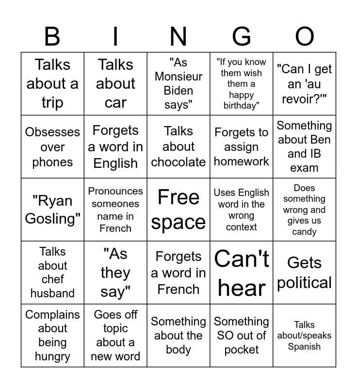 This bingo card has a free space and 24 words: "As they say", Goes off topic about a new word, Talks about chocolate, Complains about being hungry, "Can I get an 'au revoir?'", Talks about a trip, Obsesses over phones, Talks about car, Uses English word in the wrong context, Forgets a word in French, Forgets to assign homework, "Ryan Gosling", Can't hear, Gets political, Forgets a word in English, Something SO out of pocket, Does something wrong and gives us candy, "As Monsieur Biden says", Something about Ben and IB exam, Pronounces someones name in French, Talks about/speaks Spanish, Talks about chef husband, "If you know them wish them a happy birthday" and Something about the body.