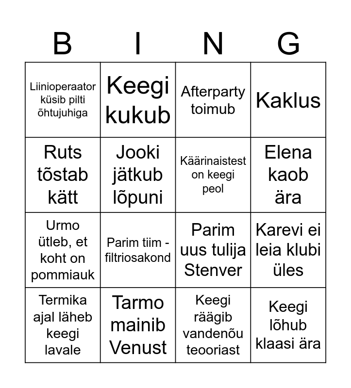 This bingo card has 16 words: Tarmo mainib Venust, Karevi ei leia klubi üles, Afterparty toimub, Liinioperaator küsib pilti õhtujuhiga, Urmo ütleb, et koht on pommiauk, Keegi kukub, Parim uus tulija Stenver, Keegi räägib vandenõu teooriast, Ruts tõstab kätt, Jooki jätkub lõpuni, Termika ajal läheb keegi lavale, Kaklus, Parim tiim - filtriosakond, Elena kaob ära, Käärinaistest on keegi peol and Keegi lõhub klaasi ära.