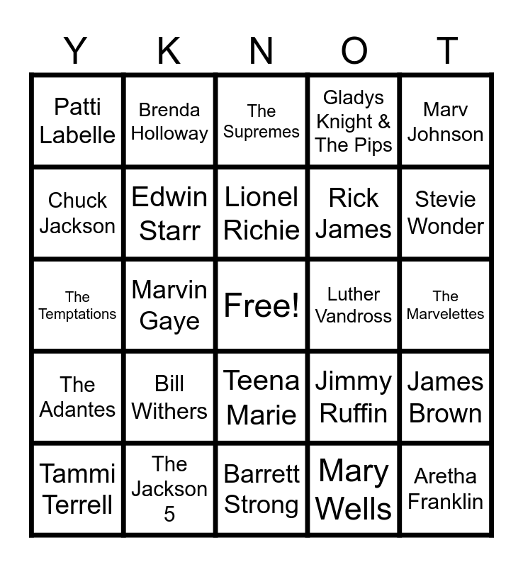 This bingo card has a free space and 47 words: Al Green, Aretha Franklin, Ashford and Simpson, Barrett Strong, Bill Withers, Bobby Taylor and The Vancouvers, Brenda Holloway, Chuck Berry, Chuck Jackson, David Ruffin, Edwin Starr, Gladys Knight & The Pips, James Brown, Jimmy Ruffin, Junior Walker & The All-Stars, Kim Weston, Lionel Richie, Luther Vandross, Martha and the Vandellas, Marv Johnson, Marvin Gaye, Mary Wells, Patti Labelle, Rick James, Smokey Robinson & The Miracles -, Stevie Wonder, Tammi Terrell, Teddy Pendergrass, Teena Marie, The Adantes, The Commodores, The Contours, The Elgins, The Four Tops, The Isley Brothers, The Jackson 5, The Marvelettes, The Miracles, The Monitors, The Originals, The Spinners, The Supremes, The Temptations, The Undisputed Truth, The Velvelettes, Thelma Houston and Valerie Simpson.